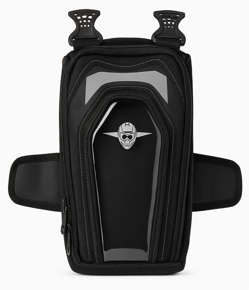 Fabricado en material resistente con sistema de fijación magnética al tanque. Incluye compartimento principal con cierre y correas para llevar en la mano. Ideal para transportar objetos personales de forma práctica sin ocupar espacio adicional en la moto.